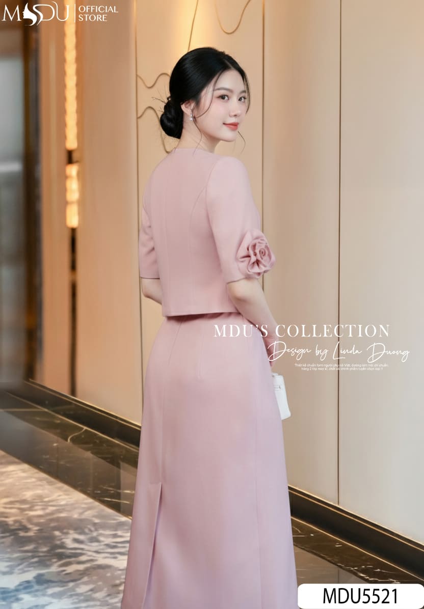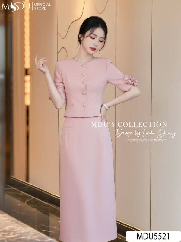 Delicate yet commanding, MDU5521 captures the essence of quiet luxury in a soft rose tone. The top features a round neckline with gold-accented buttons and short sleeves finished with charming knotted details — a subtle nod to classic romanticism. The midi skirt flows naturally, elongating the silhouette and creating an effortlessly refined profile. Ideal for luncheons, professional settings, or graceful evening gatherings, this ensemble celebrates femininity through simplicity and timeless poise.