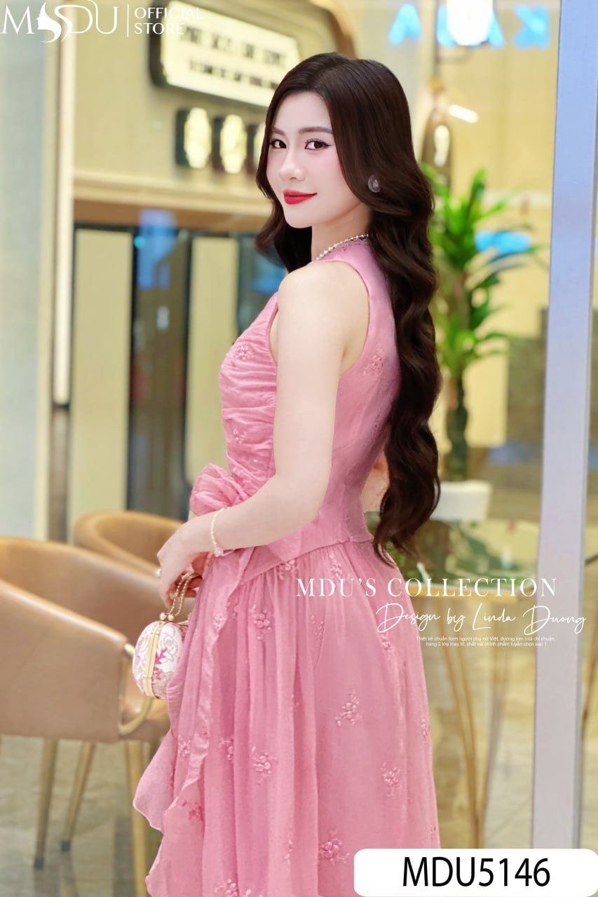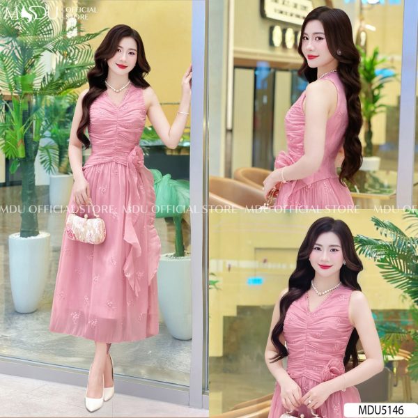 Design Highlights: MDU5146 captures the essence of romantic femininity through soft textures and graceful structure. Rendered in an enchanting rose pink hue, the dress features subtle floral embroidery that adds dimension and charm. The V-neckline and ruched bodice sculpt a flattering silhouette, while the flowing A-line skirt adorned with a cascading draped detail evokes effortless sophistication. The waist is accentuated by a fabric bow, balancing elegance and allure. Perfect for weddings, evening gatherings, or elegant daytime events, this design celebrates womanhood in its most poetic form.