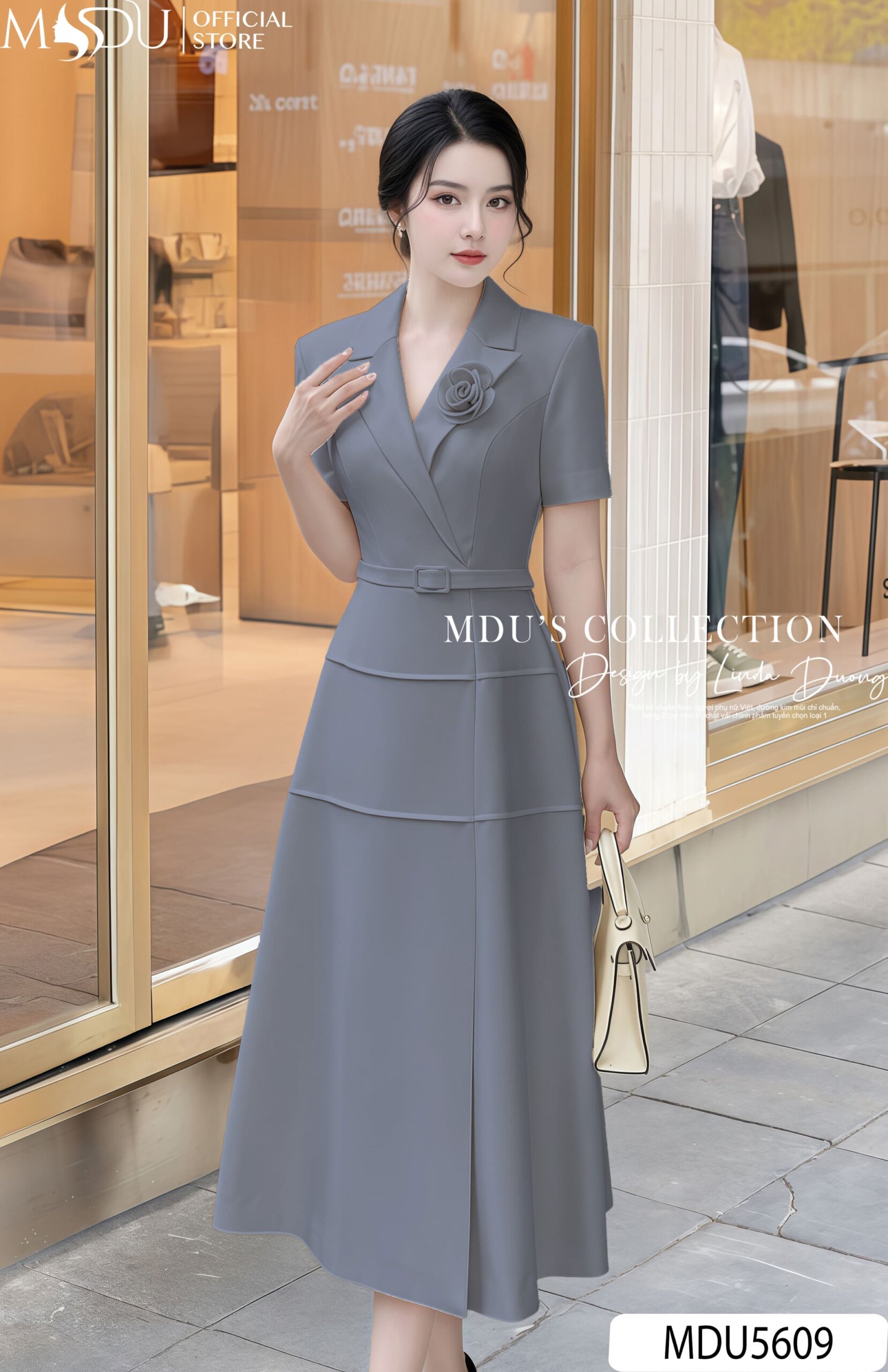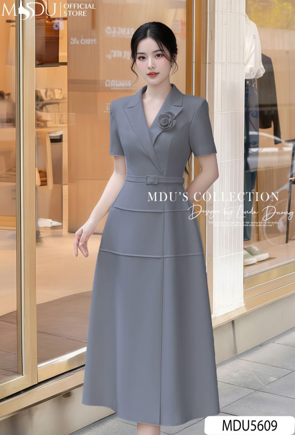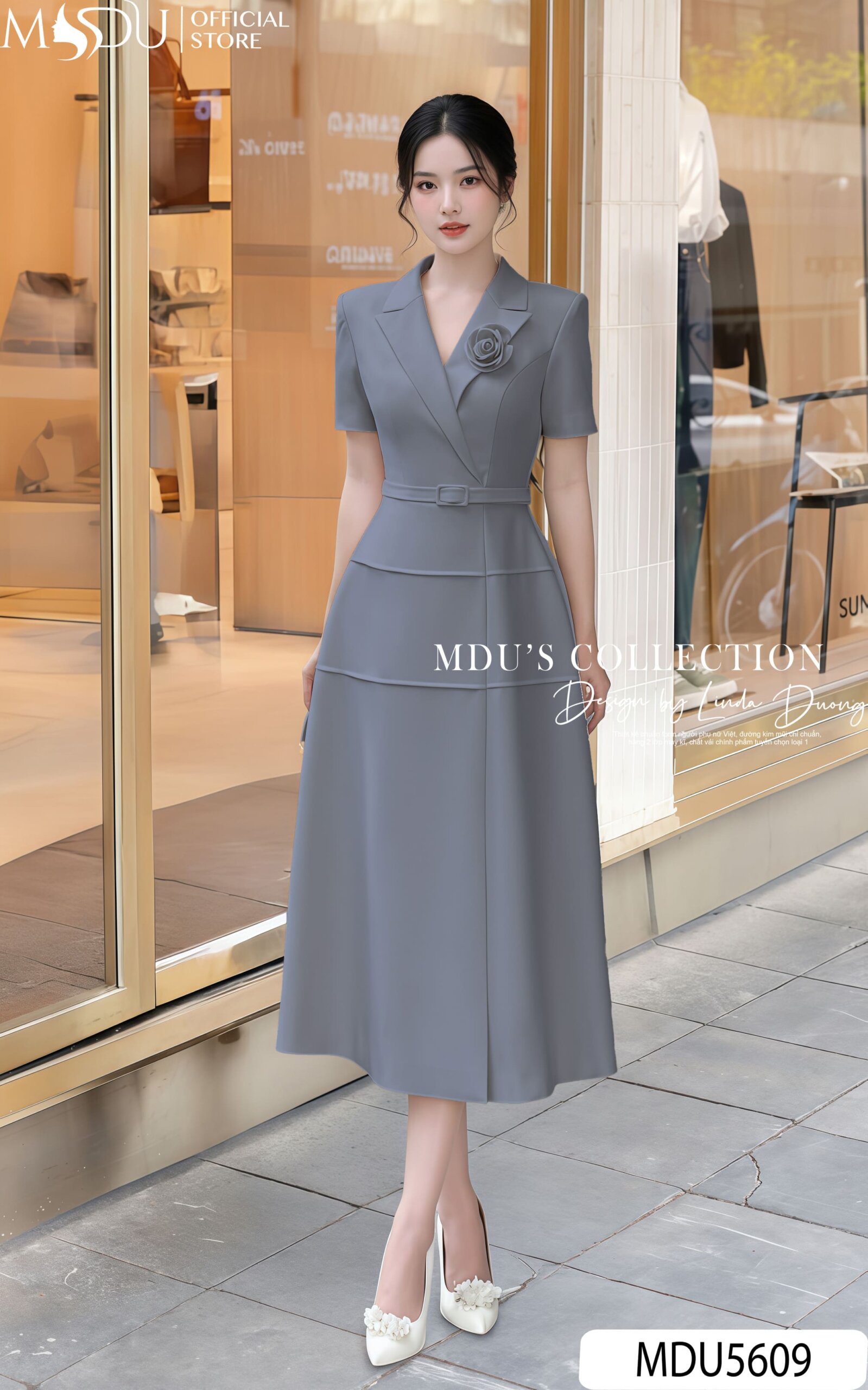 The MDU5609 dress embodies refined sophistication through its tailored structure and graceful silhouette. Presented in an elegant silver-grey tone, this midi dress features a sharp lapel collar, wrapped bodice, and a removable belt that enhances the waistline for a sculpted feminine form. The short sleeves and layered panel detailing add architectural precision, while the signature rosette accent on the chest brings a touch of delicate artistry. Perfect for executive meetings, luncheons, and formal occasions, this design harmonizes strength and softness – a statement of composure and class for the modern woman.