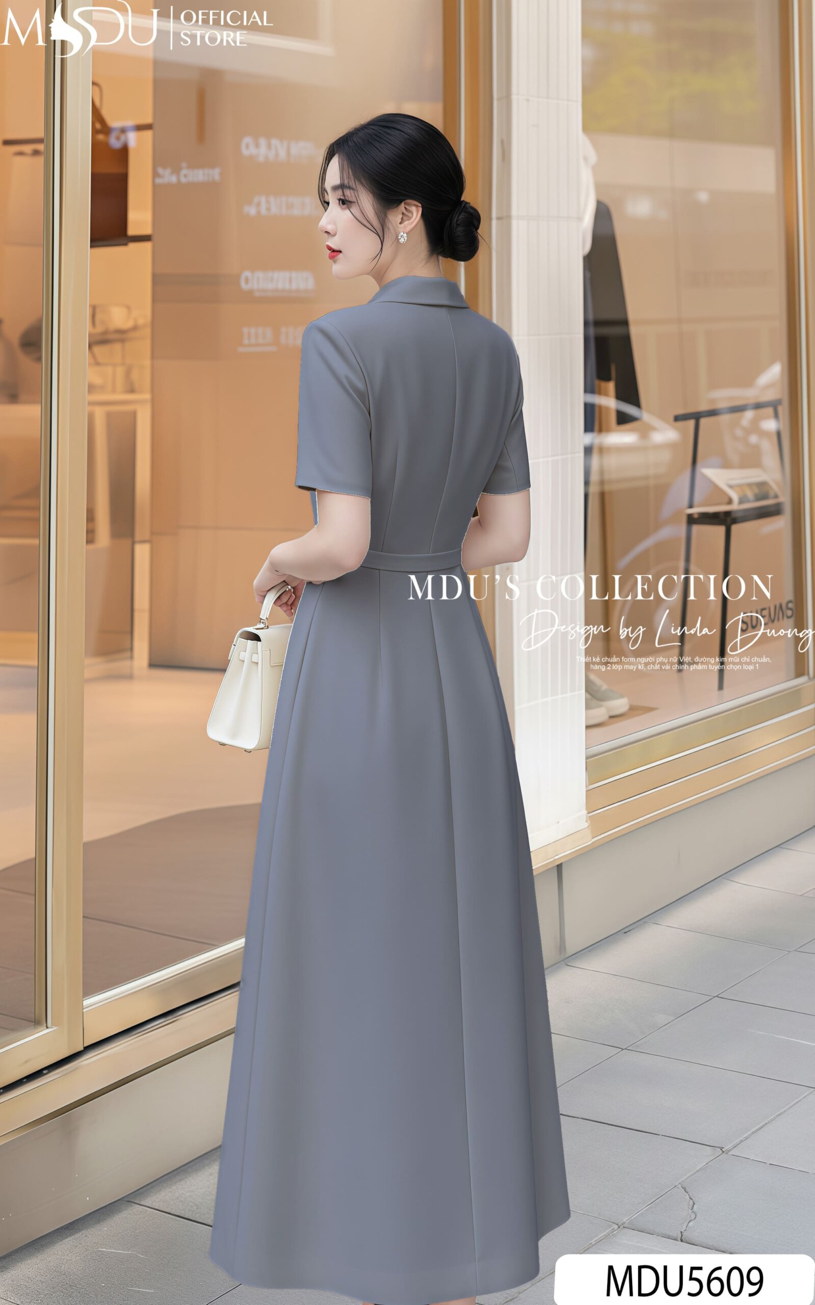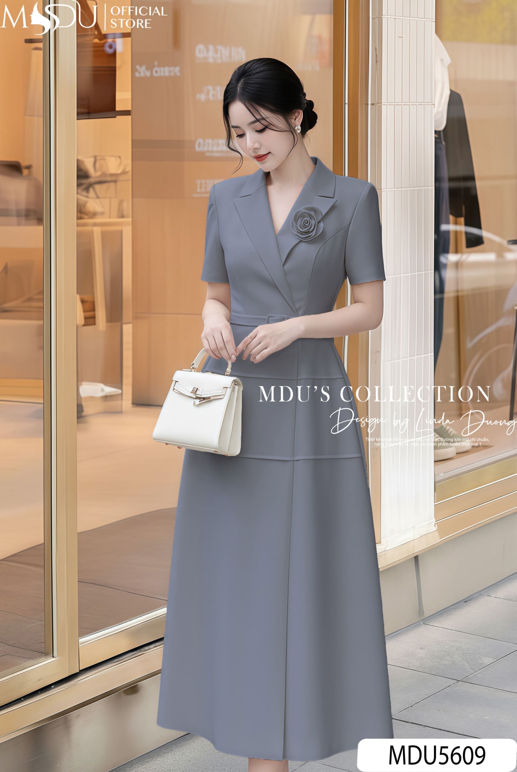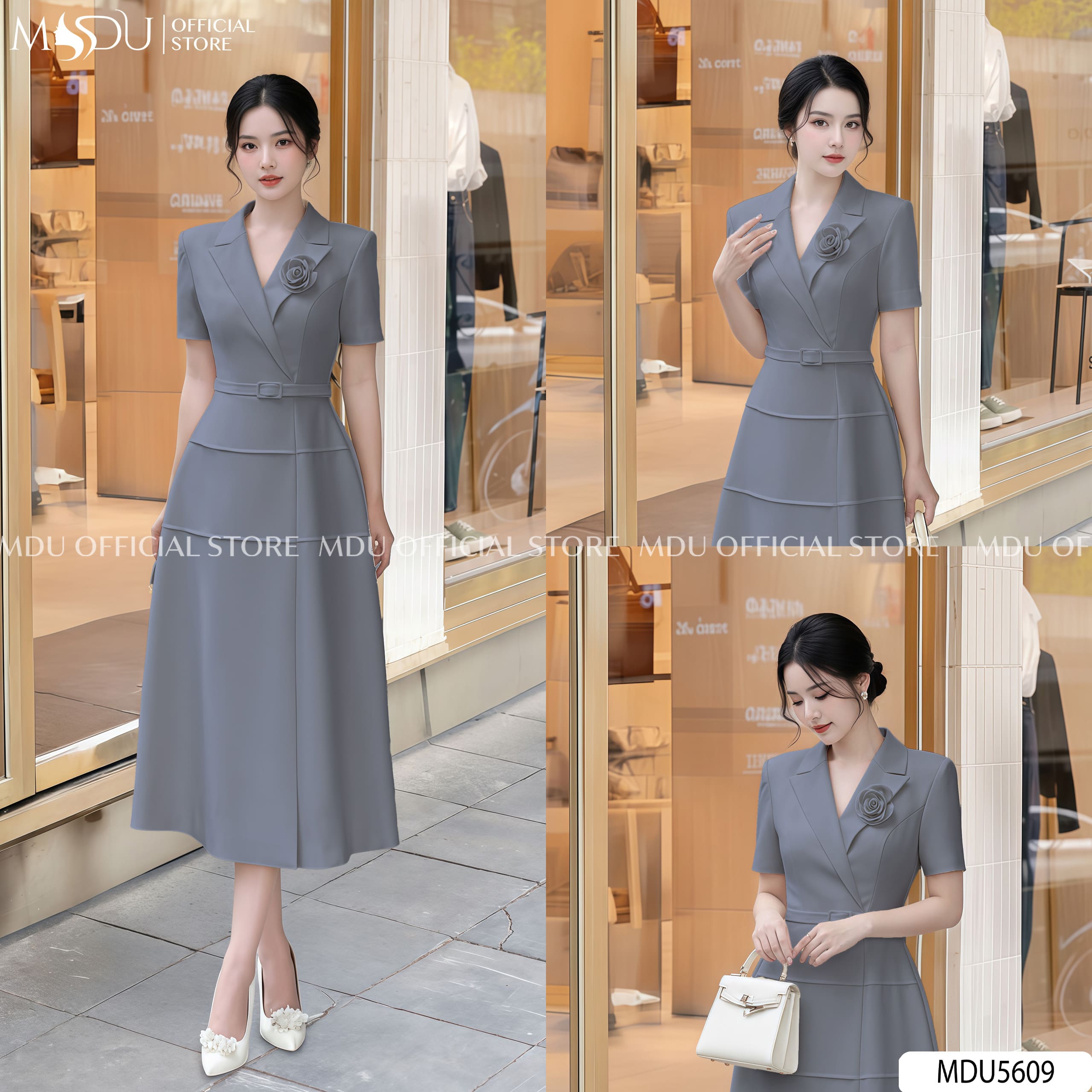The MDU5609 dress embodies refined sophistication through its tailored structure and graceful silhouette. Presented in an elegant silver-grey tone, this midi dress features a sharp lapel collar, wrapped bodice, and a removable belt that enhances the waistline for a sculpted feminine form. The short sleeves and layered panel detailing add architectural precision, while the signature rosette accent on the chest brings a touch of delicate artistry. Perfect for executive meetings, luncheons, and formal occasions, this design harmonizes strength and softness – a statement of composure and class for the modern woman.