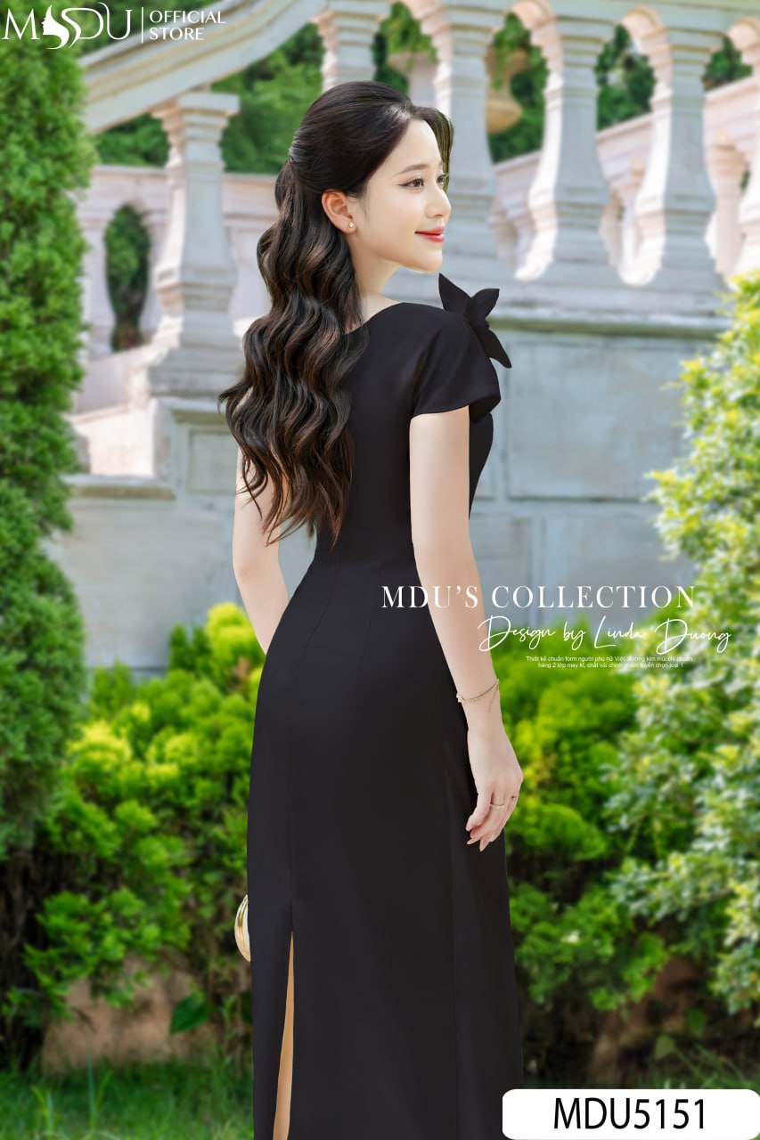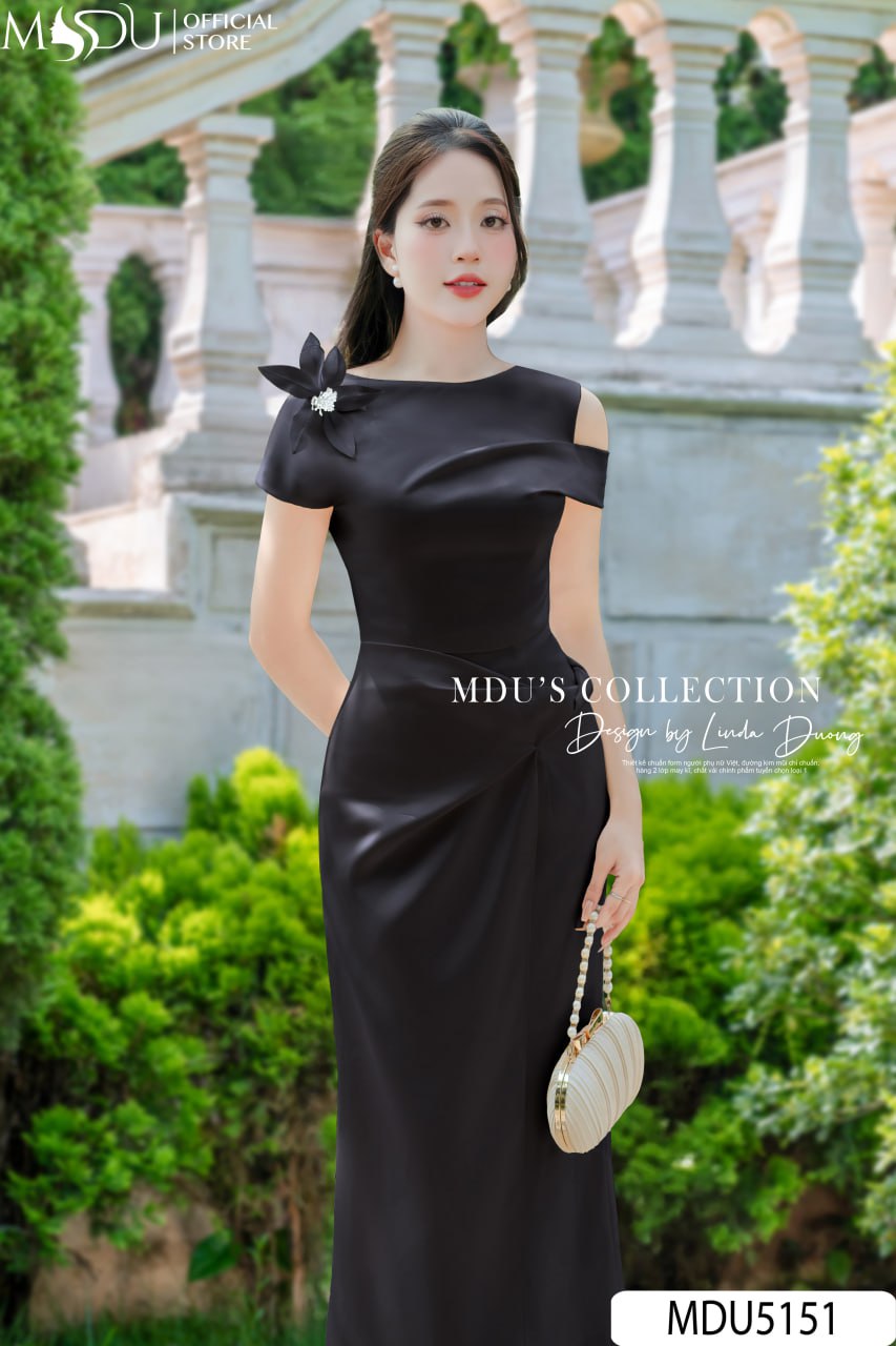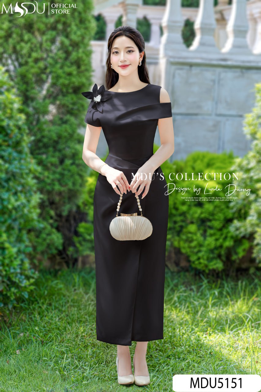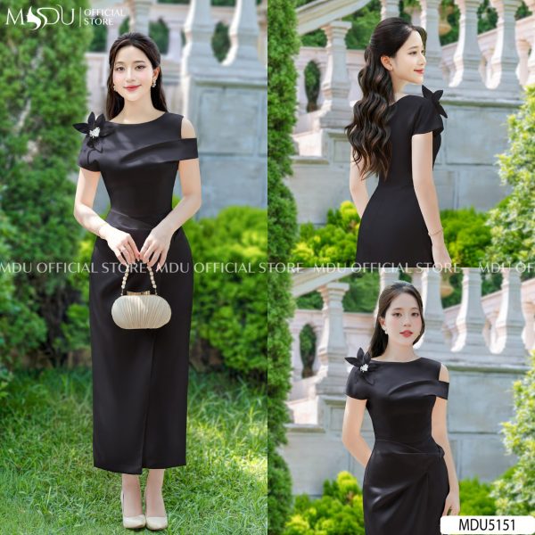 Design Highlights: MDU5151 is the epitome of sophistication, combining timeless elegance with modern design. The dress features a sleek, black silhouette with an off-shoulder detail, beautifully complemented by an exquisite floral embellishment on the left shoulder. The form-fitting structure highlights the feminine curves, while the pencil skirt with a high slit at the back adds a touch of sultriness. Perfect for formal occasions, cocktail parties, or elegant evening events, this dress brings a refined charm that commands attention.